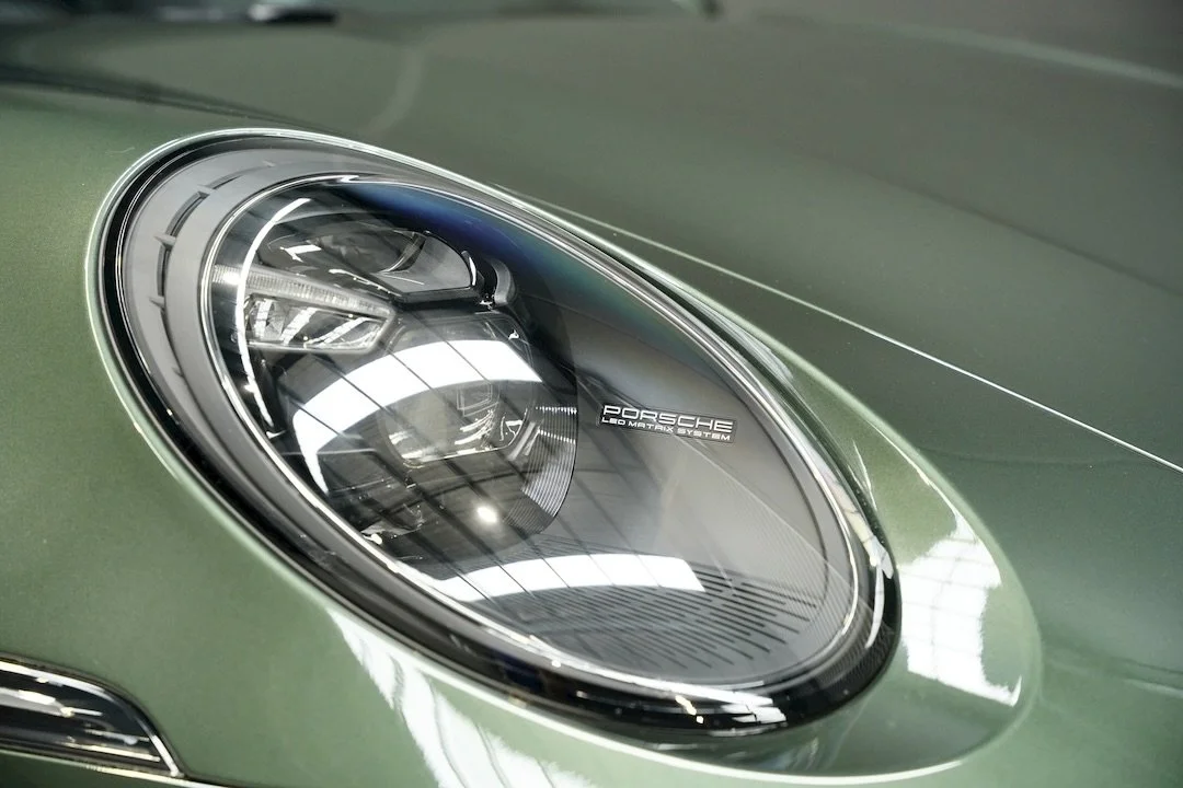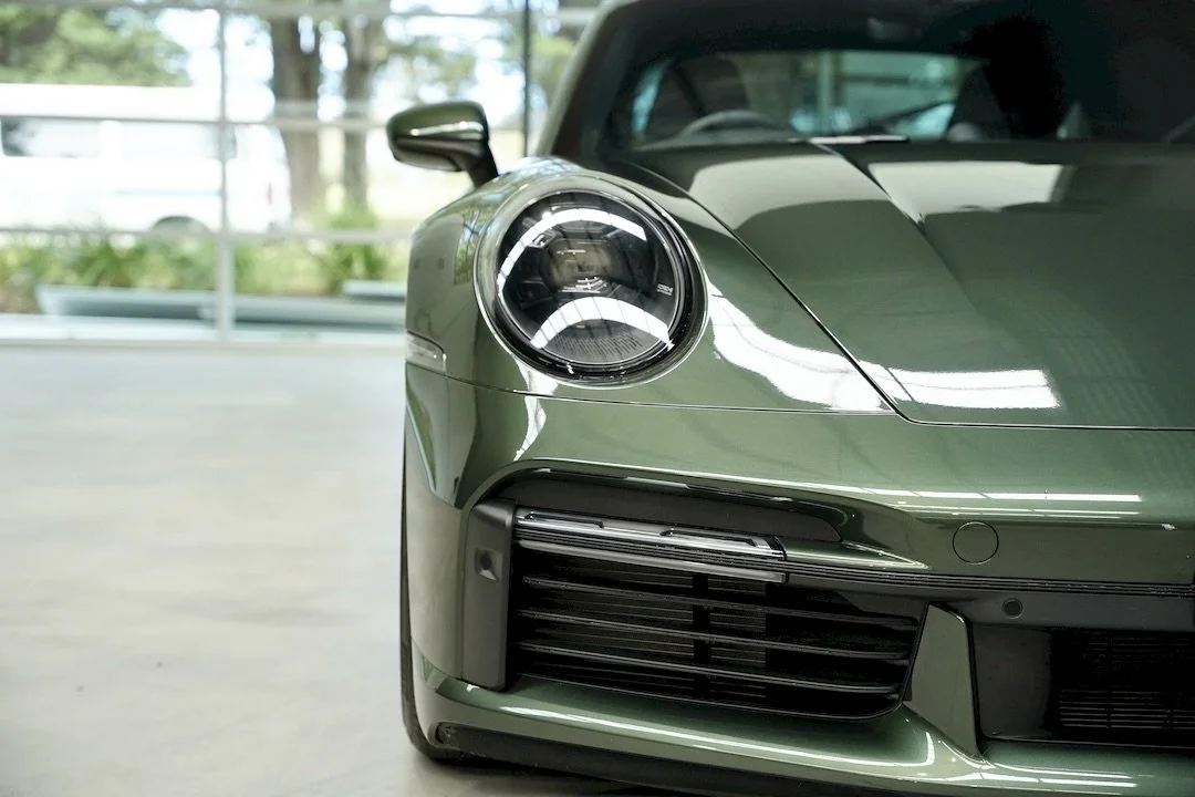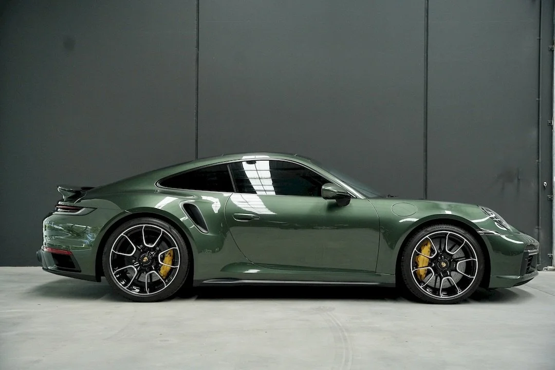 One owner 2021 built and complied MY22 911 Turbo S finished in Oak Green Metallic (Paint To Sample) over Black Leather and travelled only 1,866 kilometres. Ordered new with the following factory cost options: